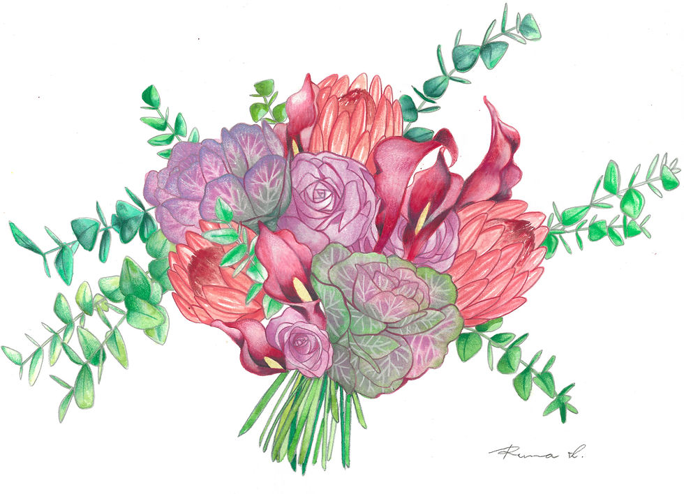「結婚式のブーケを Iizuka Runa さんに描いていただきました。